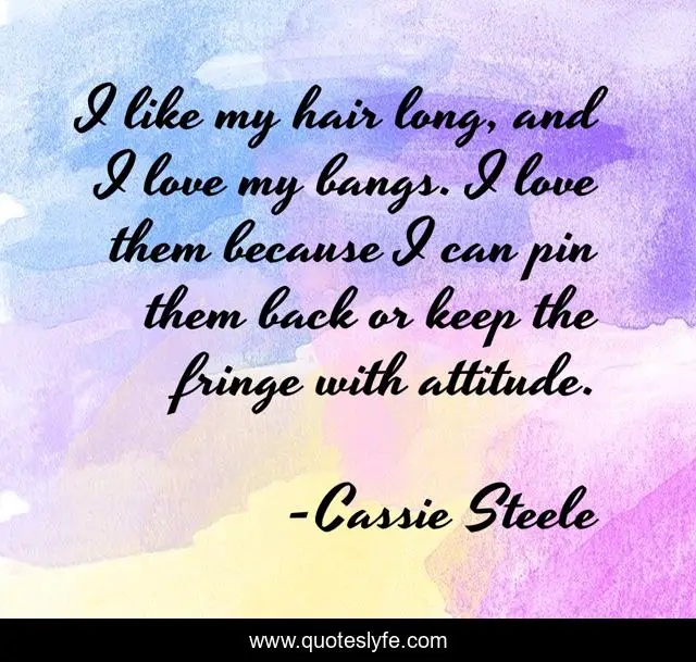 This page presents the quote "I like my hair long, and I love my bangs. I love them because I can pin them back or keep the fringe with attitude.". Author of this quote is Cassie Steele. This quote is about hair, love, long, affection,.