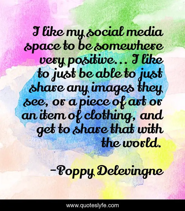 This page presents the quote "I like my social media space to be somewhere very positive... I like to just be able to just share any images they see, or a piece of art or an item of clothing, and get to share that with the world.". Author of this quote is Poppy Delevingne. This quote is about social media, art, space,.
