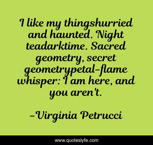 This page presents the quote "I like my thingshurried and haunted. Night teadarktime. Sacred geometry, secret geometrypetal-flame whisper: I am here, and you aren't.". Author of this quote is Virginia Petrucci. This quote is about quotes, poetry,.
