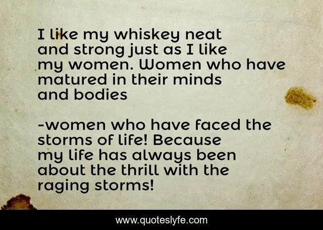 This page presents the quote "I like my whiskey neat and strong just as I like my women. Women who have matured in their minds and bodies". Author of this quote is women who have faced the storms of life! Because my life has always been about the thrill with the raging storms!. .