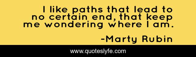 This page presents the quote "I like paths that lead to no certain end, that keep me wondering where I am.". Author of this quote is Marty Rubin. This quote is about life, the-unknown, wonder,.
