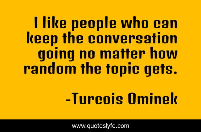 This page presents the quote "I like people who can keep the conversation going no matter how random the topic gets.". Author of this quote is Turcois Ominek. This quote is about random-thought, people, communication, topics, random, talking, communication-skills, conversation,.
