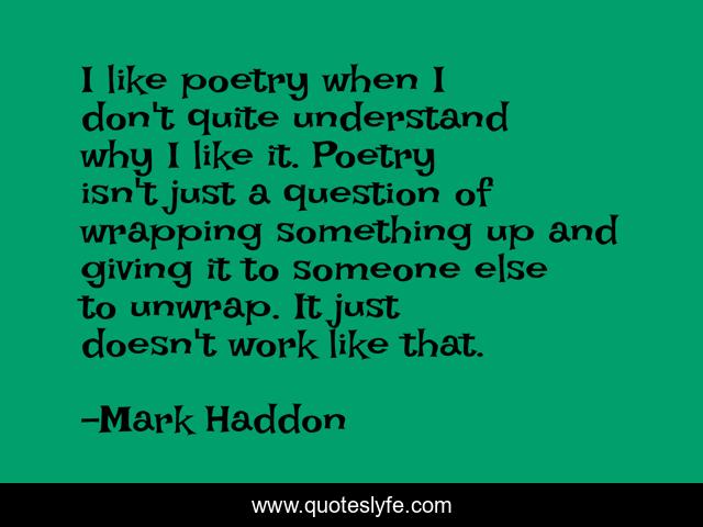 This page presents the quote "I like poetry when I don't quite understand why I like it. Poetry isn't just a question of wrapping something up and giving it to someone else to unwrap. It just doesn't work like that.". Author of this quote is Mark Haddon. This quote is about giving, work, why,.