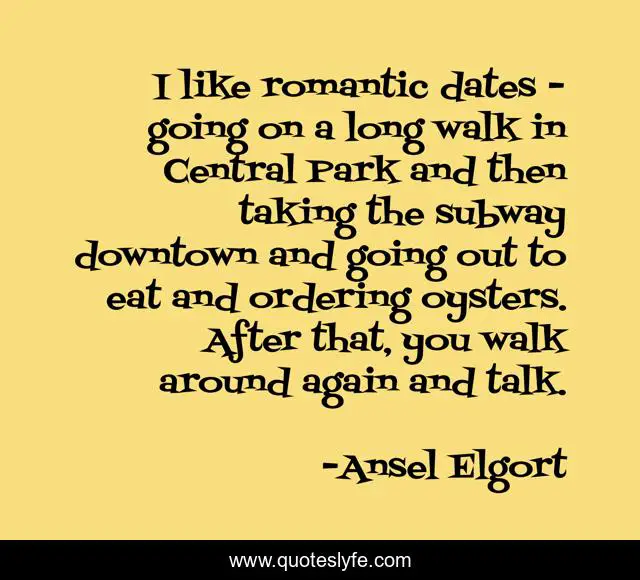 This page presents the quote "I like romantic dates - going on a long walk in Central Park and then taking the subway downtown and going out to eat and ordering oysters. After that, you walk around again and talk.". Author of this quote is Ansel Elgort. This quote is about long, walk,.