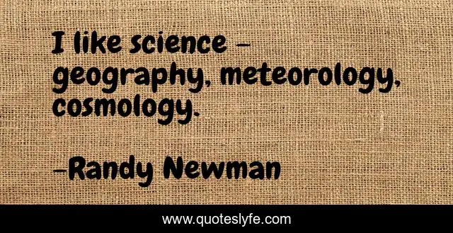 This page presents the quote "I like science - geography, meteorology, cosmology.". Author of this quote is Randy Newman. This quote is about geography, like, cosmology,.