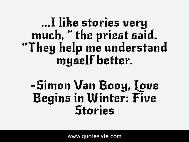 This page presents the quote "...I like stories very much, ” the priest said. “They help me understand myself better.". Author of this quote is Simon Van Booy, Love Begins in Winter: Five Stories. This quote is about understanding-oneself, stories, knowledge, understanding,.