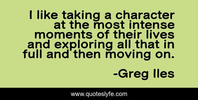 This page presents the quote "I like taking a character at the most intense moments of their lives and exploring all that in full and then moving on.". Author of this quote is Greg Iles. This quote is about moments, character, moving,.