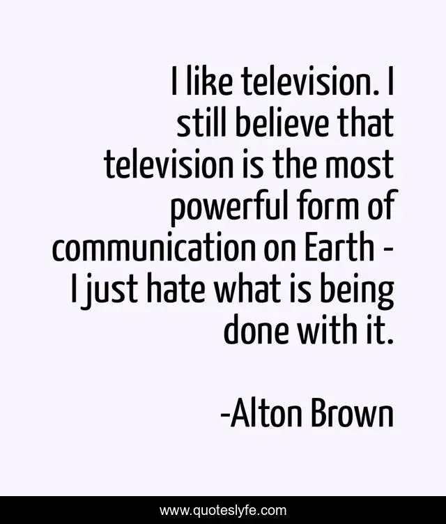 This page presents the quote "I like television. I still believe that television is the most powerful form of communication on Earth - I just hate what is being done with it.". Author of this quote is Alton Brown. This quote is about powerful, believe, hate,.