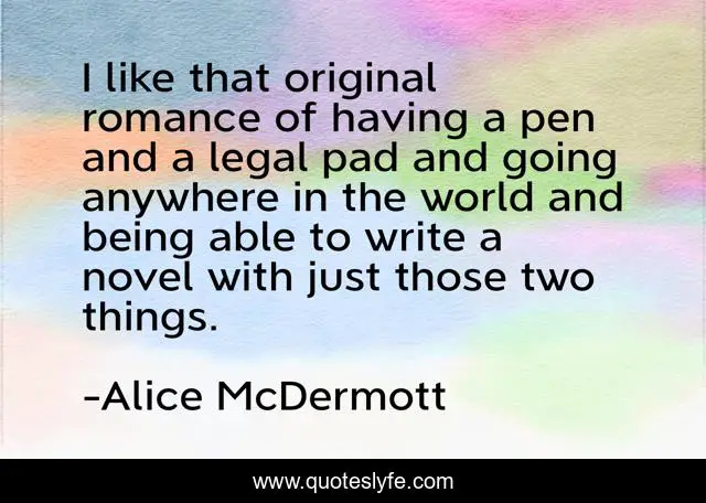 This page presents the quote "I like that original romance of having a pen and a legal pad and going anywhere in the world and being able to write a novel with just those two things.". Author of this quote is Alice McDermott. This quote is about world, pen, two,.