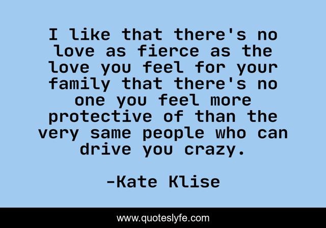 This page presents the quote "I like that there's no love as fierce as the love you feel for your family that there's no one you feel more protective of than the very same people who can drive you crazy.". Author of this quote is Kate Klise. This quote is about crazy, love, affection, people,.
