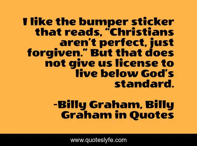 This page presents the quote "I like the bumper sticker that reads, “Christians aren’t perfect, just forgiven.” But that does not give us license to live below God’s standard.". Author of this quote is Billy Graham, Billy Graham in Quotes. This quote is about billy-graham, christianity,.