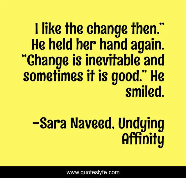 This page presents the quote "I like the change then.” He held her hand again. “Change is inevitable and sometimes it is good.” He smiled.". Author of this quote is Sara Naveed, Undying Affinity. This quote is about love, relationship, romance, saranaveed, undyingaffinity, ahmarzarish, affection,.