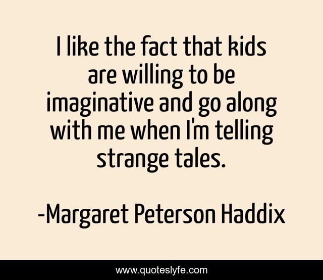 This page presents the quote "I like the fact that kids are willing to be imaginative and go along with me when I'm telling strange tales.". Author of this quote is Margaret Peterson Haddix. This quote is about imagination, stories, author,.