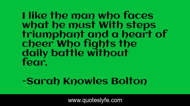 This page presents the quote "I like the man who faces what he must With steps triumphant and a heart of cheer Who fights the daily battle without fear.". Author of this quote is Sarah Knowles Bolton. This quote is about day, one,.