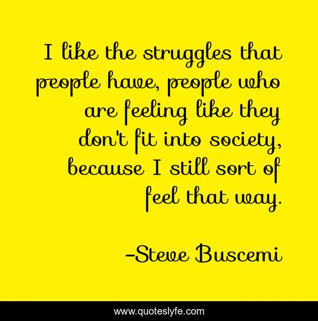 This page presents the quote "I like the struggles that people have, people who are feeling like they don't fit into society, because I still sort of feel that way.". Author of this quote is Steve Buscemi. This quote is about feeling, way, people,.