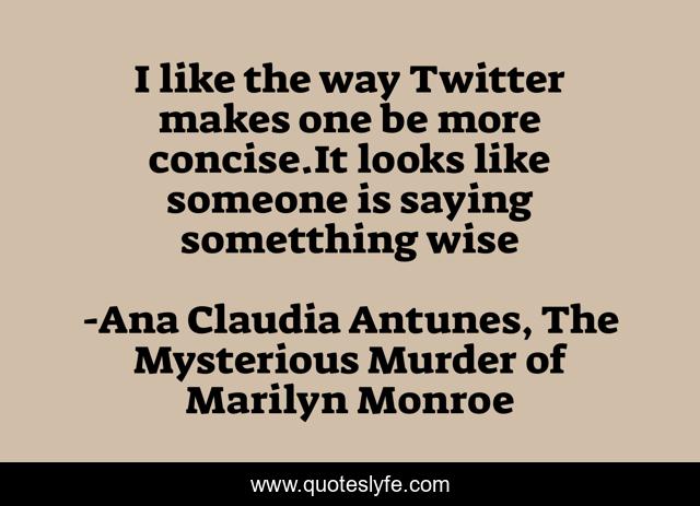 This page presents the quote "I like the way Twitter makes one be more concise.It looks like someone is saying sometthing wise". Author of this quote is Ana Claudia Antunes, The Mysterious Murder of Marilyn Monroe. This quote is about limits, word, 140, 140-character, concise, fast-paced, communication, twitter, space,.