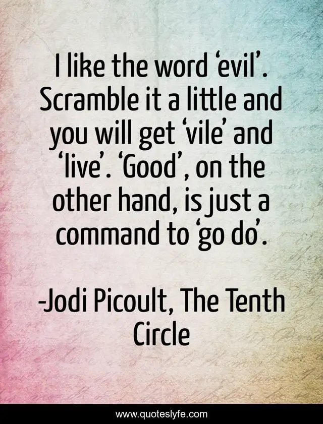 This page presents the quote "I like the word ‘evil’. Scramble it a little and you will get ‘vile’ and ‘live’. ‘Good’, on the other hand, is just a command to ‘go do’.". Author of this quote is Jodi Picoult, The Tenth Circle. This quote is about good-and-evil, language,.