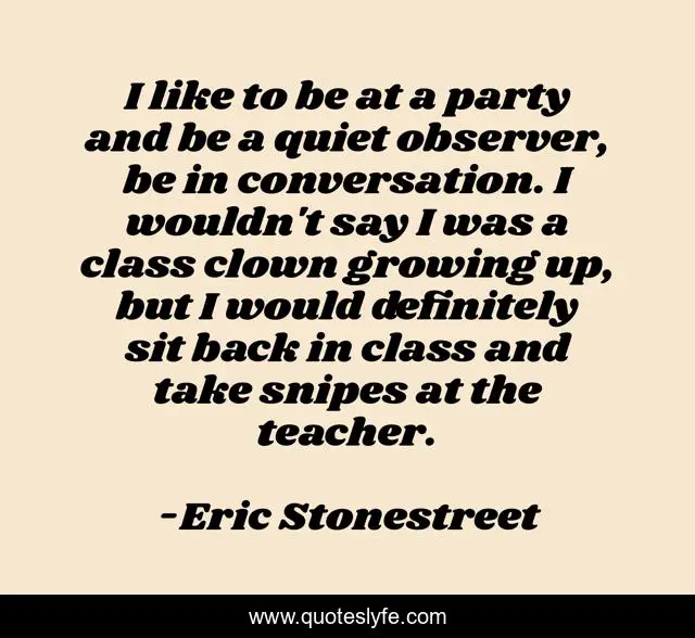 This page presents the quote "I like to be at a party and be a quiet observer, be in conversation. I wouldn't say I was a class clown growing up, but I would definitely sit back in class and take snipes at the teacher.". Author of this quote is Eric Stonestreet. This quote is about conversation, growing up,.