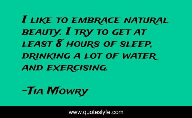 This page presents the quote "I like to embrace natural beauty. I try to get at least 8 hours of sleep, drinking a lot of water and exercising.". Author of this quote is Tia Mowry. This quote is about water, sleep, fitness,.