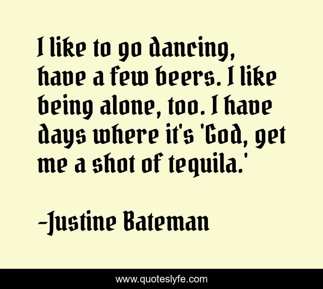 This page presents the quote "I like to go dancing, have a few beers. I like being alone, too. I have days where it's 'God, get me a shot of tequila.'". Author of this quote is Justine Bateman. This quote is about alone, me, being alone,.
