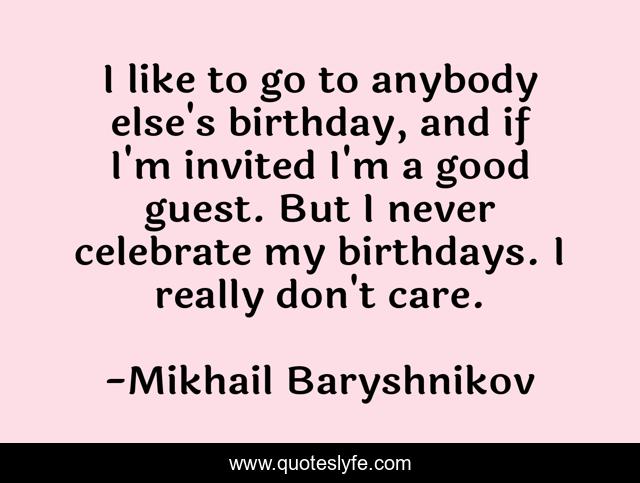 This page presents the quote "I like to go to anybody else's birthday, and if I'm invited I'm a good guest. But I never celebrate my birthdays. I really don't care.". Author of this quote is Mikhail Baryshnikov. This quote is about good, celebrate, care,.