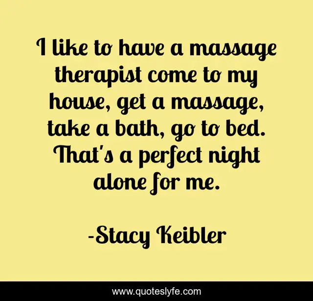This page presents the quote "I like to have a massage therapist come to my house, get a massage, take a bath, go to bed. That's a perfect night alone for me.". Author of this quote is Stacy Keibler. This quote is about me, perfect, night,.
