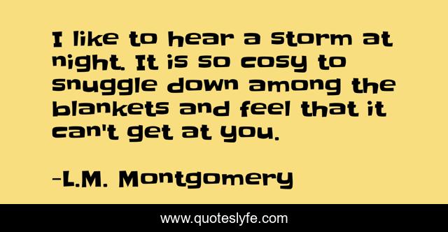 This page presents the quote "I like to hear a storm at night. It is so cosy to snuggle down among the blankets and feel that it can't get at you.". Author of this quote is L.M. Montgomery. This quote is about beds, blankets, comfort, snuggle, storms,.
