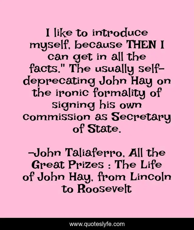 This page presents the quote "I like to introduce myself, because THEN I can get in all the facts." The usually self-deprecating John Hay on the ironic formality of signing his own commission as Secretary of State.". Author of this quote is John Taliaferro, All the Great Prizes : The Life of John Hay, from Lincoln to Roosevelt. This quote is about arrogance, humility,.
