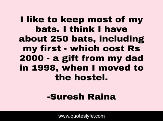 This page presents the quote "I like to keep most of my bats. I think I have about 250 bats, including my first - which cost Rs 2000 - a gift from my dad in 1998, when I moved to the hostel.". Author of this quote is Suresh Raina. This quote is about think, gift, first,.