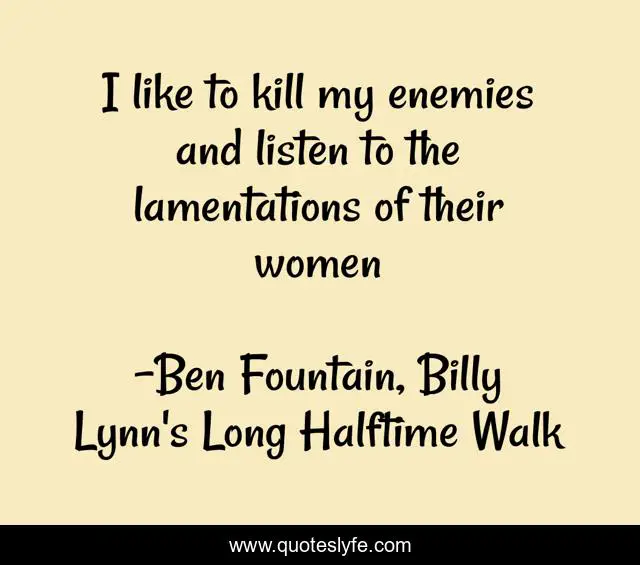 This page presents the quote "I like to kill my enemies and listen to the lamentations of their women". Author of this quote is Ben Fountain, Billy Lynn's Long Halftime Walk. .