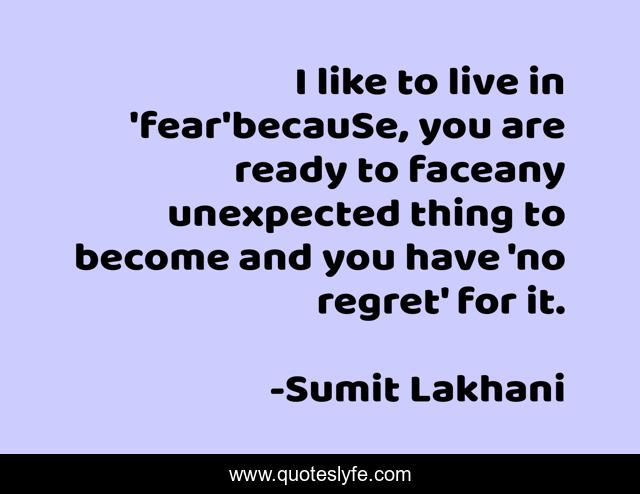 This page presents the quote "I like to live in 'fear'becauSe, you are ready to faceany unexpected thing to become and you have 'no regret' for it.". Author of this quote is Sumit Lakhani. This quote is about fear, unexpected, regret,.