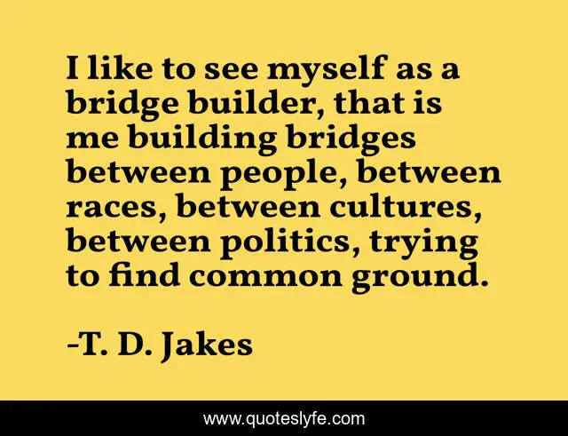 This page presents the quote "I like to see myself as a bridge builder, that is me building bridges between people, between races, between cultures, between politics, trying to find common ground.". Author of this quote is T. D. Jakes. This quote is about me, myself, people,.