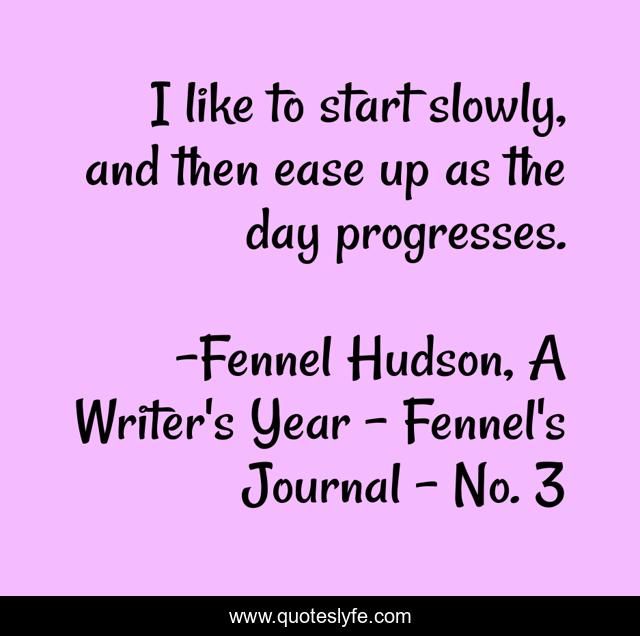 "Fennel Hudson, A Writer's Year - Fennel's Journal - No. 3 Quotes." Quoteslyfe.com, 2025. Mon. 15 Dec. 2025. <https://www.quoteslyfe.com/quote/I-like-to-start-slowly-and-then-250735>.