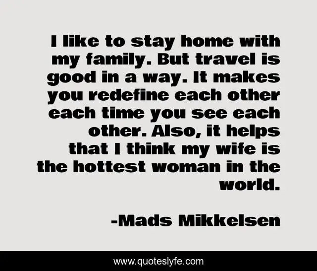 This page presents the quote "I like to stay home with my family. But travel is good in a way. It makes you redefine each other each time you see each other. Also, it helps that I think my wife is the hottest woman in the world.". Author of this quote is Mads Mikkelsen. This quote is about home, family, time,.