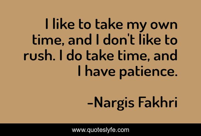 This page presents the quote "I like to take my own time, and I don't like to rush. I do take time, and I have patience.". Author of this quote is Nargis Fakhri. This quote is about my own, like, time,.