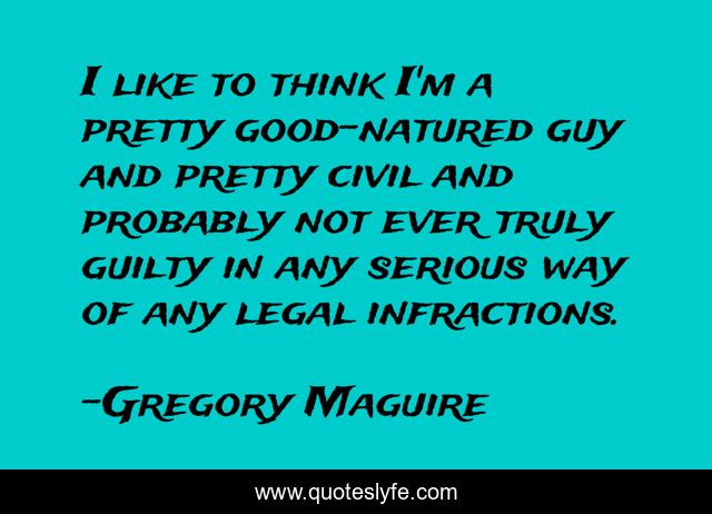 This page presents the quote "I like to think I'm a pretty good-natured guy and pretty civil and probably not ever truly guilty in any serious way of any legal infractions.". Author of this quote is Gregory Maguire. This quote is about guilty, think, way,.