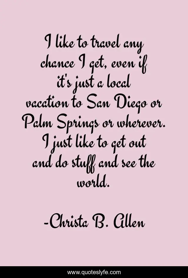 This page presents the quote "I like to travel any chance I get, even if it's just a local vacation to San Diego or Palm Springs or wherever. I just like to get out and do stuff and see the world.". Author of this quote is Christa B. Allen. This quote is about world, travel, vacation,.