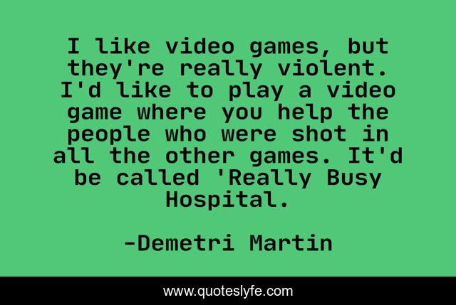 This page presents the quote "I like video games, but they're really violent. I'd like to play a video game where you help the people who were shot in all the other games. It'd be called 'Really Busy Hospital.". Author of this quote is Demetri Martin. This quote is about video-games, funny, humor, comedians, games, helping-others, demetri-martin, comedy,.
