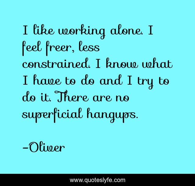 This page presents the quote "I like working alone. I feel freer, less constrained. I know what I have to do and I try to do it. There are no superficial hangups.". Author of this quote is Oliver. This quote is about being-alone, freedom, aloneness, alone-but-not-lonely, alone, constrained,.
