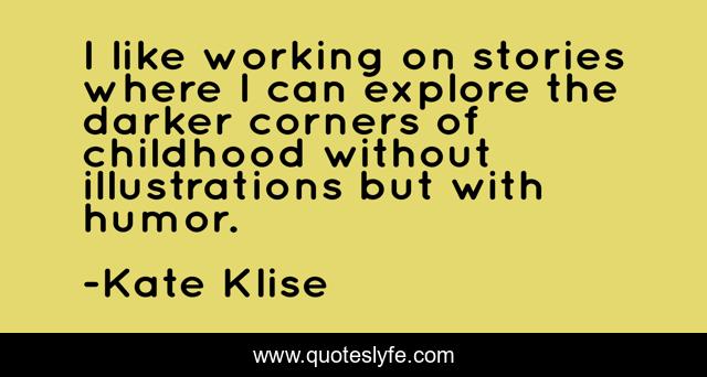 This page presents the quote "I like working on stories where I can explore the darker corners of childhood without illustrations but with humor.". Author of this quote is Kate Klise. This quote is about i can, childhood, working,.
