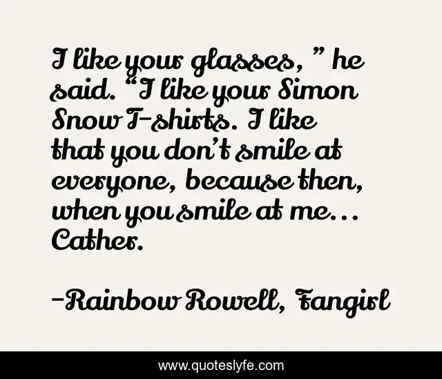 This page presents the quote "I like your glasses, ” he said. “I like your Simon Snow T-shirts. I like that you don’t smile at everyone, because then, when you smile at me... Cather.". Author of this quote is Rainbow Rowell, Fangirl. This quote is about smile, happiness, sweet,.