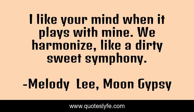 This page presents the quote "I like your mind when it plays with mine. We harmonize, like a dirty sweet symphony.". Author of this quote is Melody Lee, Moon Gypsy. This quote is about relationships, love, poetry, affection,.