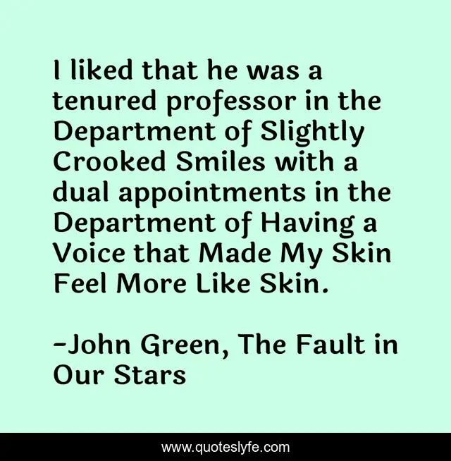 This page presents the quote "I liked that he was a tenured professor in the Department of Slightly Crooked Smiles with a dual appointments in the Department of Having a Voice that Made My Skin Feel More Like Skin.". Author of this quote is John Green, The Fault in Our Stars. .
