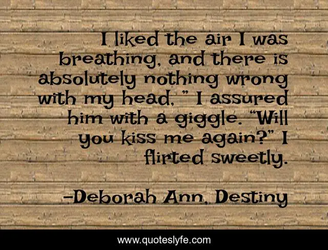 This page presents the quote "I liked the air I was breathing, and there is absolutely nothing wrong with my head, ” I assured him with a giggle. “Will you kiss me again?” I flirted sweetly.". Author of this quote is Deborah Ann, Destiny. This quote is about series, fairytale, young-adult-romance, first-love, paranormal,.
