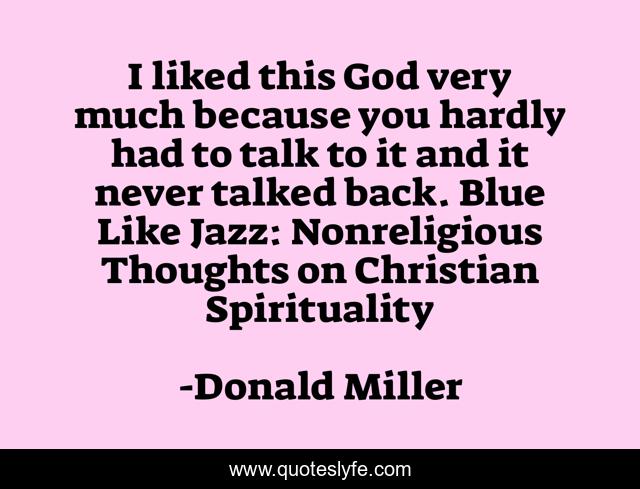 This page presents the quote "I liked this God very much because you hardly had to talk to it and it never talked back. Blue Like Jazz: Nonreligious Thoughts on Christian Spirituality". Author of this quote is Donald Miller. This quote is about spirituality, unbelief, christianity, prayer,.