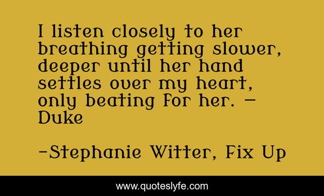 This page presents the quote "I listen closely to her breathing getting slower, deeper until her hand settles over my heart, only beating for her. — Duke". Author of this quote is Stephanie Witter, Fix Up. This quote is about new-adult, patch-up-series, contemporary-romance, na, contemporary, romance, fix-up, college,.