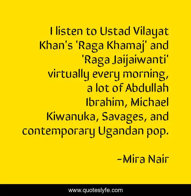 This page presents the quote "I listen to Ustad Vilayat Khan's 'Raga Khamaj' and 'Raga Jaijaiwanti' virtually every morning, a lot of Abdullah Ibrahim, Michael Kiwanuka, Savages, and contemporary Ugandan pop.". Author of this quote is Mira Nair. This quote is about pop, listen,.