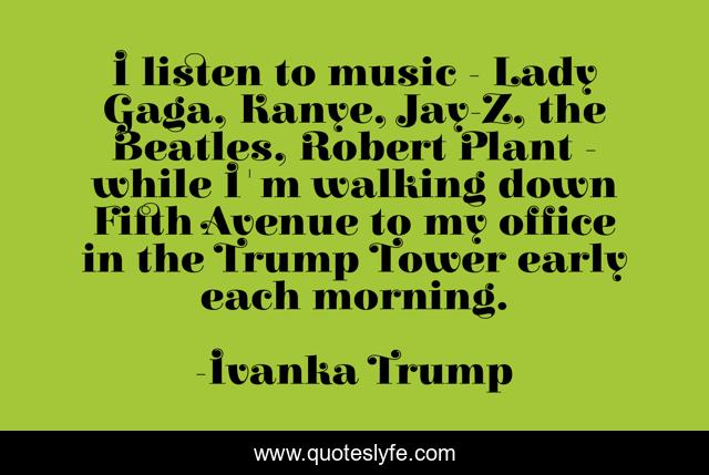 This page presents the quote "I listen to music - Lady Gaga, Kanye, Jay-Z, the Beatles, Robert Plant - while I'm walking down Fifth Avenue to my office in the Trump Tower early each morning.". Author of this quote is Ivanka Trump. This quote is about walking, music, plant,.