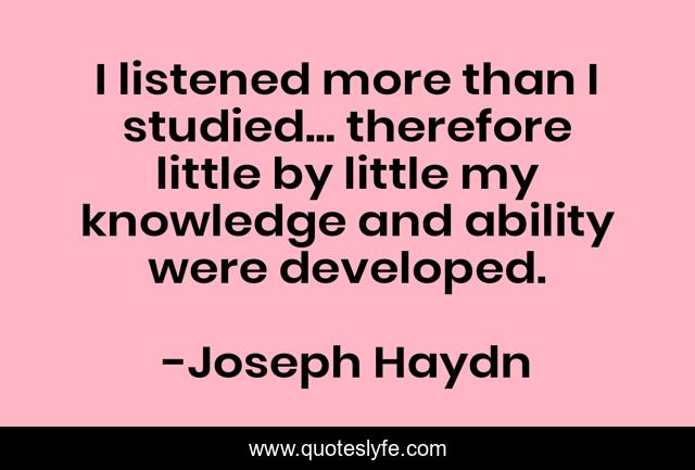 This page presents the quote "I listened more than I studied... therefore little by little my knowledge and ability were developed.". Author of this quote is Joseph Haydn. This quote is about little, ability,.