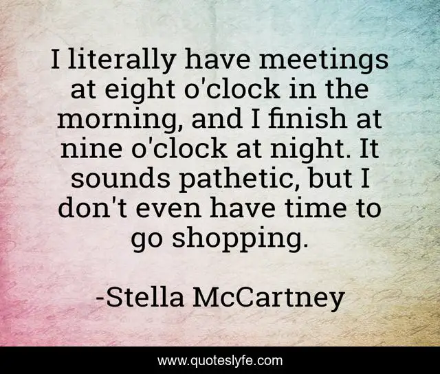 This page presents the quote "I literally have meetings at eight o'clock in the morning, and I finish at nine o'clock at night. It sounds pathetic, but I don't even have time to go shopping.". Author of this quote is Stella McCartney. This quote is about time, shopping, night,.